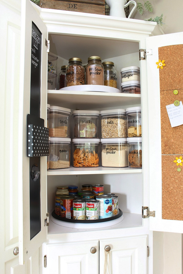 Organized kitchen cabinet with labeled containers, canned goods, and a grocery list for efficient storage.