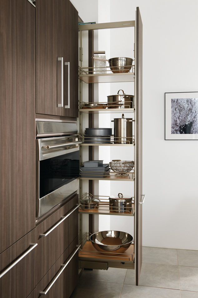 - Pull-out pantry systems bring deep storage items to easy reach