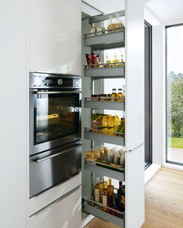 Modern kitchen with a built-in oven and a tall pull-out pantry showcasing modular kitchen storage solutions for organized and efficient space usage.